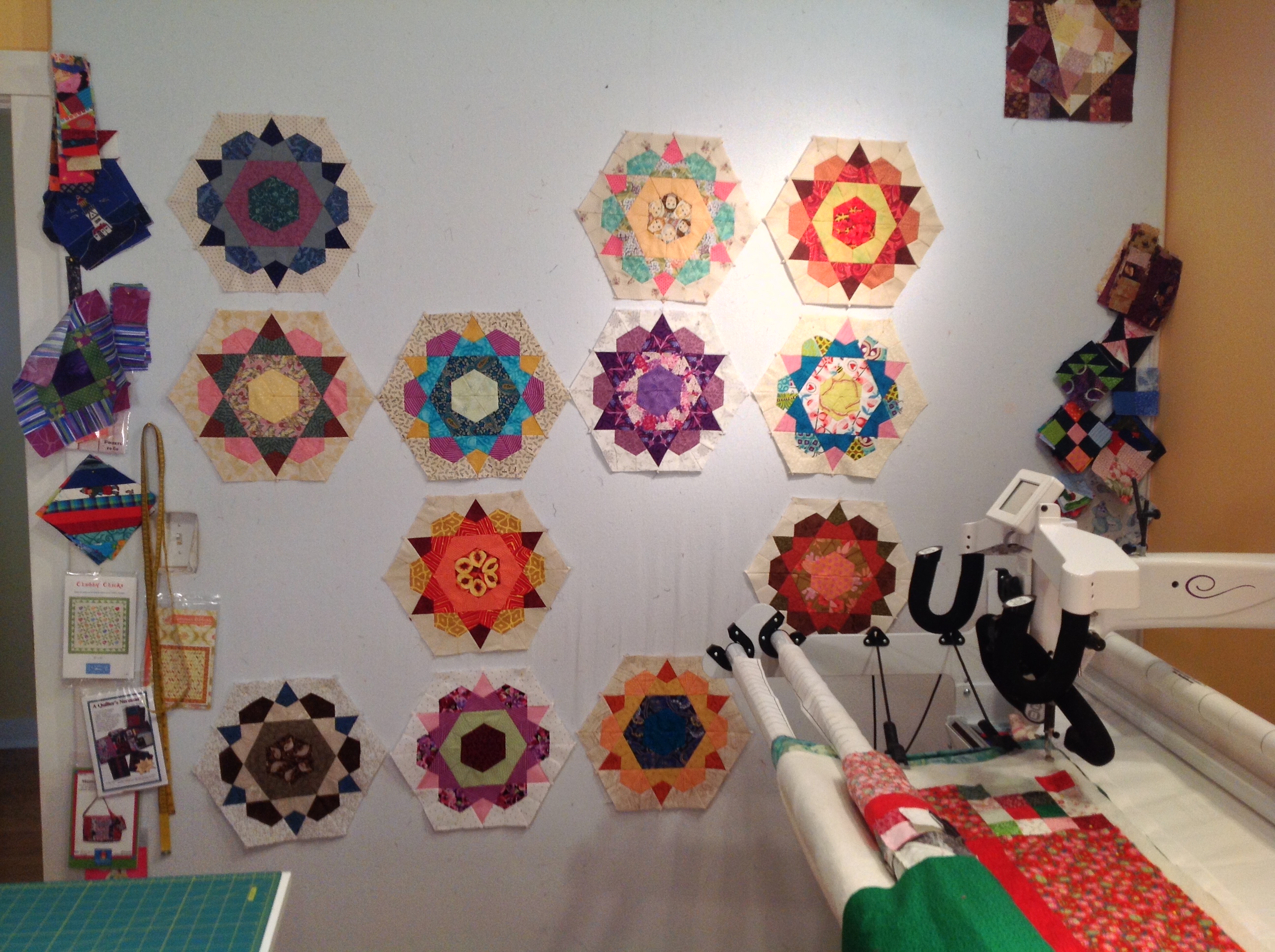 I have six of the 12 needed of these BIG hexies.  I am working on the 7th and have two more planned.  You will recall that this idea/pattern comes from Kathy Doughty and Sarah Fielke in Material Obsession 2:  More Modern Quilts with Traditional Roots.   Remember these earlier pictures of two different settings?