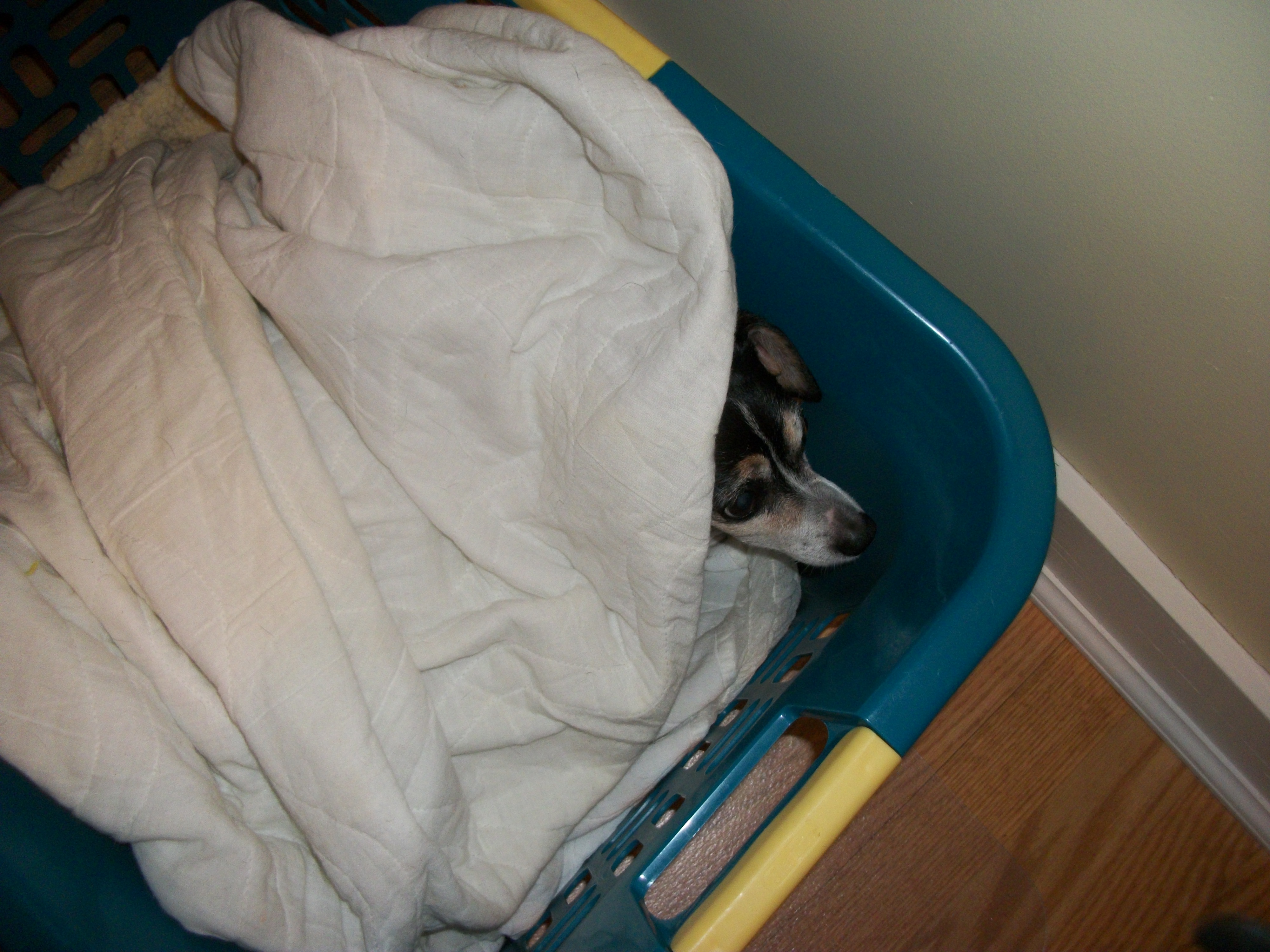 Anyway, Miss Reynolds Georgia is terrified by thunder.  She is presently in her laundry basket at my side, shaking and under the covers:
