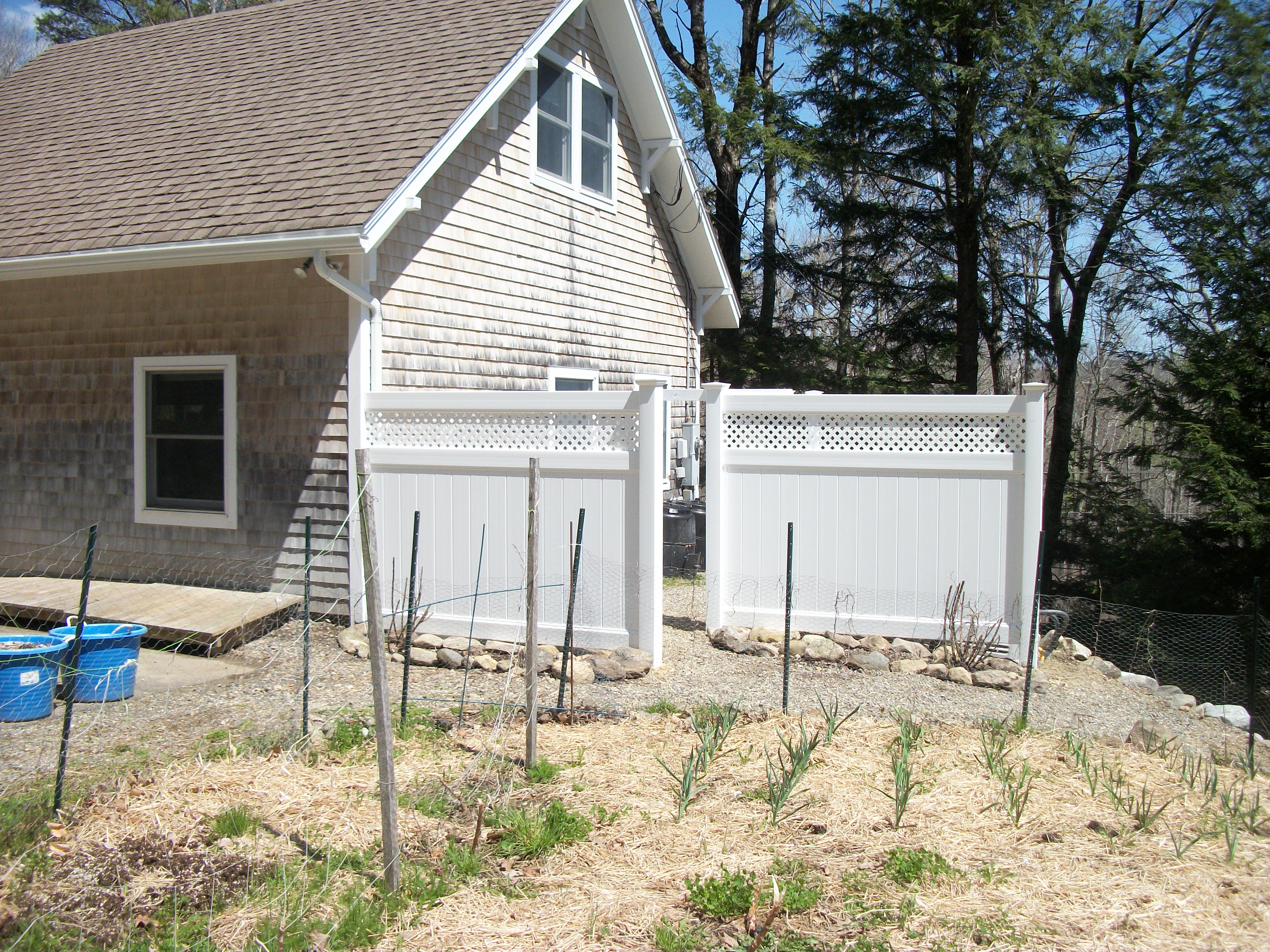 Stephen has now finished the new fence panels that hide the propane tanks and generator.  (See the garlic up in the garden?  And the strawberries?)  And you can also see the new gutter coming down the back of the fence panel next to the garage.