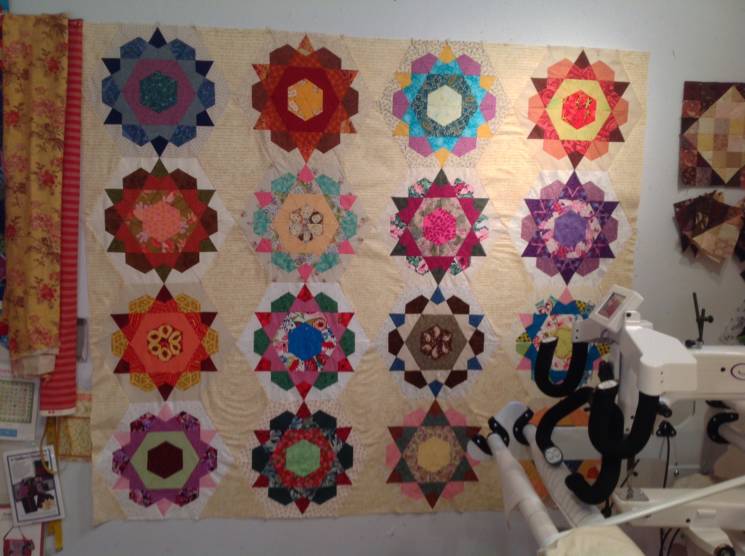 For those of you who have followed this blog over the winter, here are all the big hexies I mostly hand-sewed–and shared along the way–sewn into the quilt.  This pattern is from MATERIAL OBSESSIONS 2 by Kathy Doughty and Sarah Fielke.  There are two versions of ways to use these big hexies–all made with a little “kite”-shaped template.  This one is Kathy Doughty’s.  But I have to tell you that I love Sarah Fielke’s version as well and may well make it as a wall hanging one of these days.  I so enjoyed this project.  I wanted this 100th quilt to be something special, and I certainly think this quilt is spectacular.  If I had one thing to do over, it would be to make the border bigger.  Kathy did, and I wish I had made it 9 inches instead of 6 inches.  I’m not sure why I didn’t, actually…