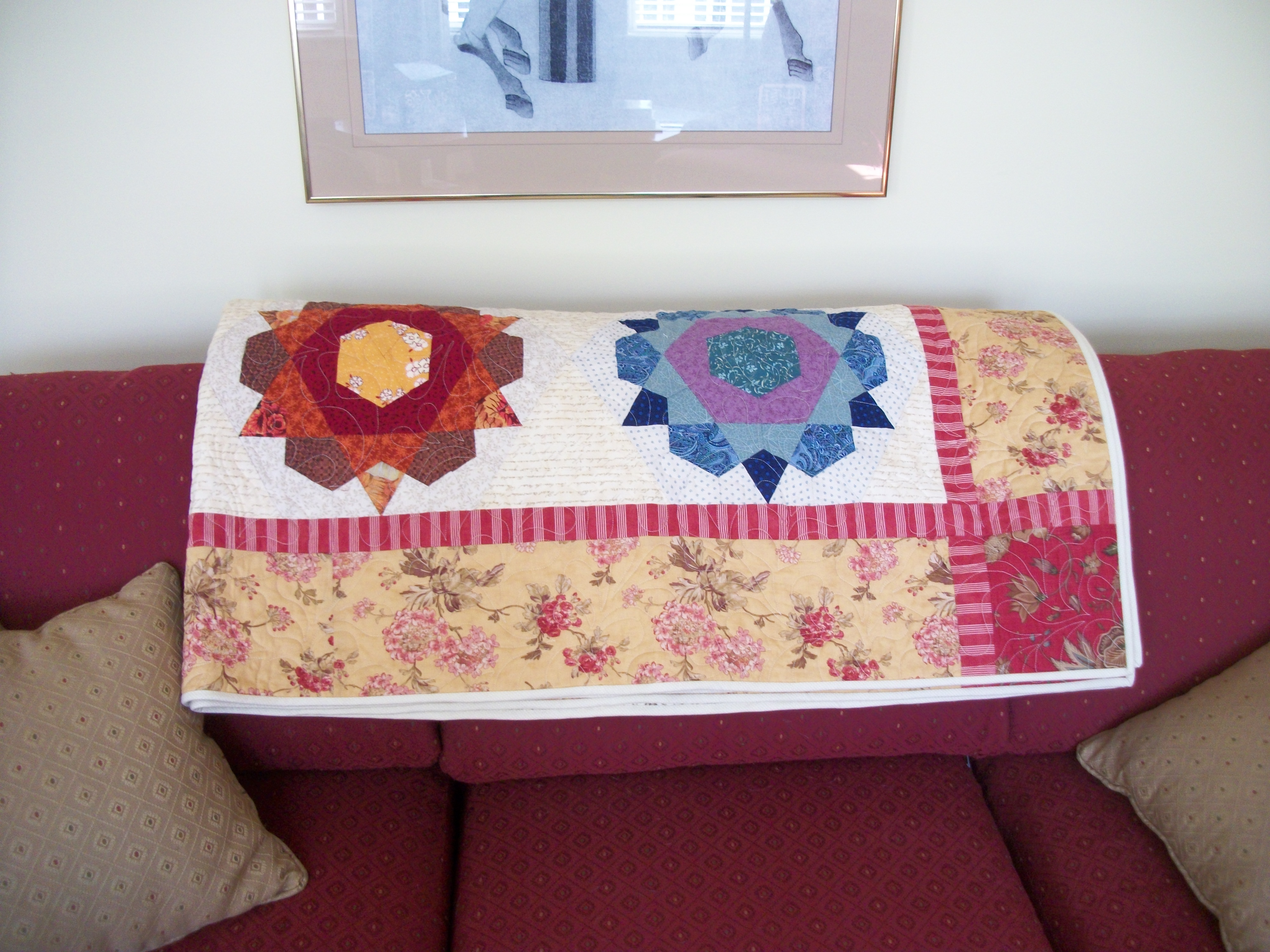 Note that the rugs are out of the living room being cleaned.  They will be back next Friday, I think.  And in a few weeks, this couch will be replaced by one with a sort of cream-colored cotton slip-cover that can be washed.  This quilt will live in this room–and the picture above the couch–which dates from early on marriage–will be replaced with another picture or a quilt…