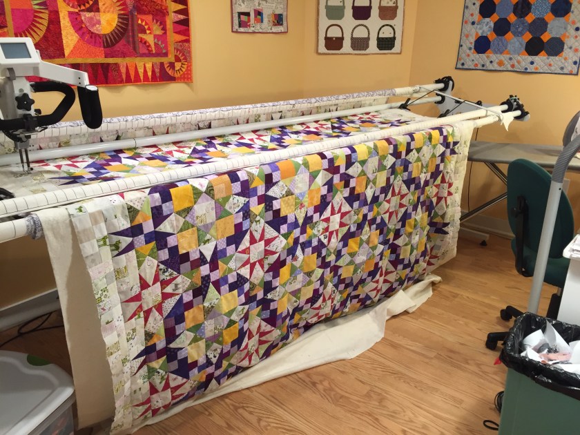 I’m going to put some wide charcoal Essex Linen (blend) borders. Right now, this quilt is not big enough, really, to be lap size. The border fabric is washed, but NOT ironed yet.