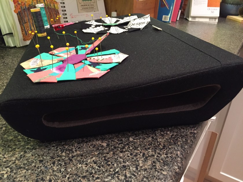 The main part of top of “Valse Brilliant” is done. I’m now picking out the English Paper Piecing papers–at night while watching tv. It’s a slow process, of course. VB, as those of us doing it in Coastal Quilters Maine call it, comes from Willyene Hammerstein’s book MILLIFIORE QUILTS. (I did not do WH’s border treatment.) My “rules”–setting rules comes from workshops with Timna Tarr–were simple: brights and text in every block.