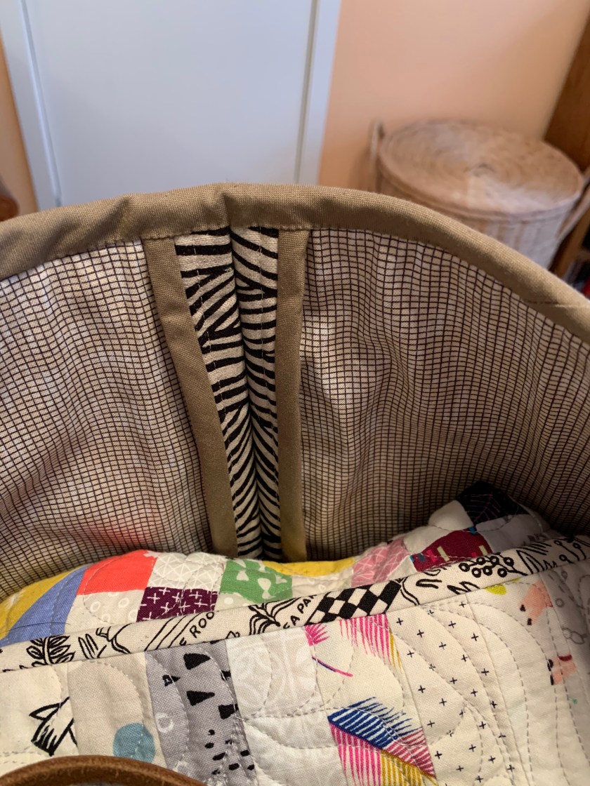 I love the way Kelly bound the inside seams—to avoid having to lay in the lining separately and turn the bag, etc. Next time I will sew the binding on the right side in the ditch—so the seam line does not show on this side. The pattern calls for that, but I was squeamish about catching the back, folded piece for sure. I’m not good at that. No one would care about seeing this seam line really. It just looks like more quilting lines.