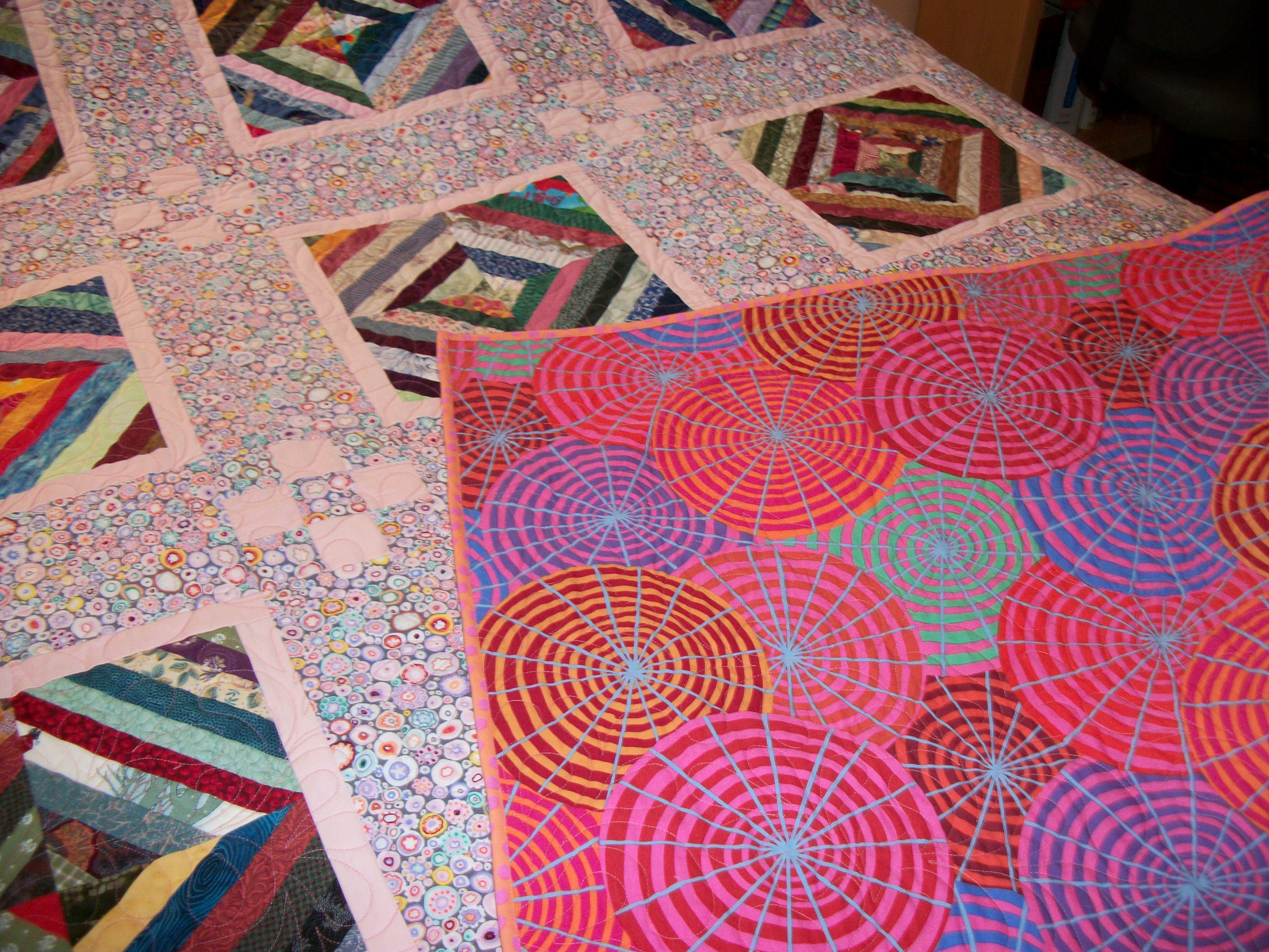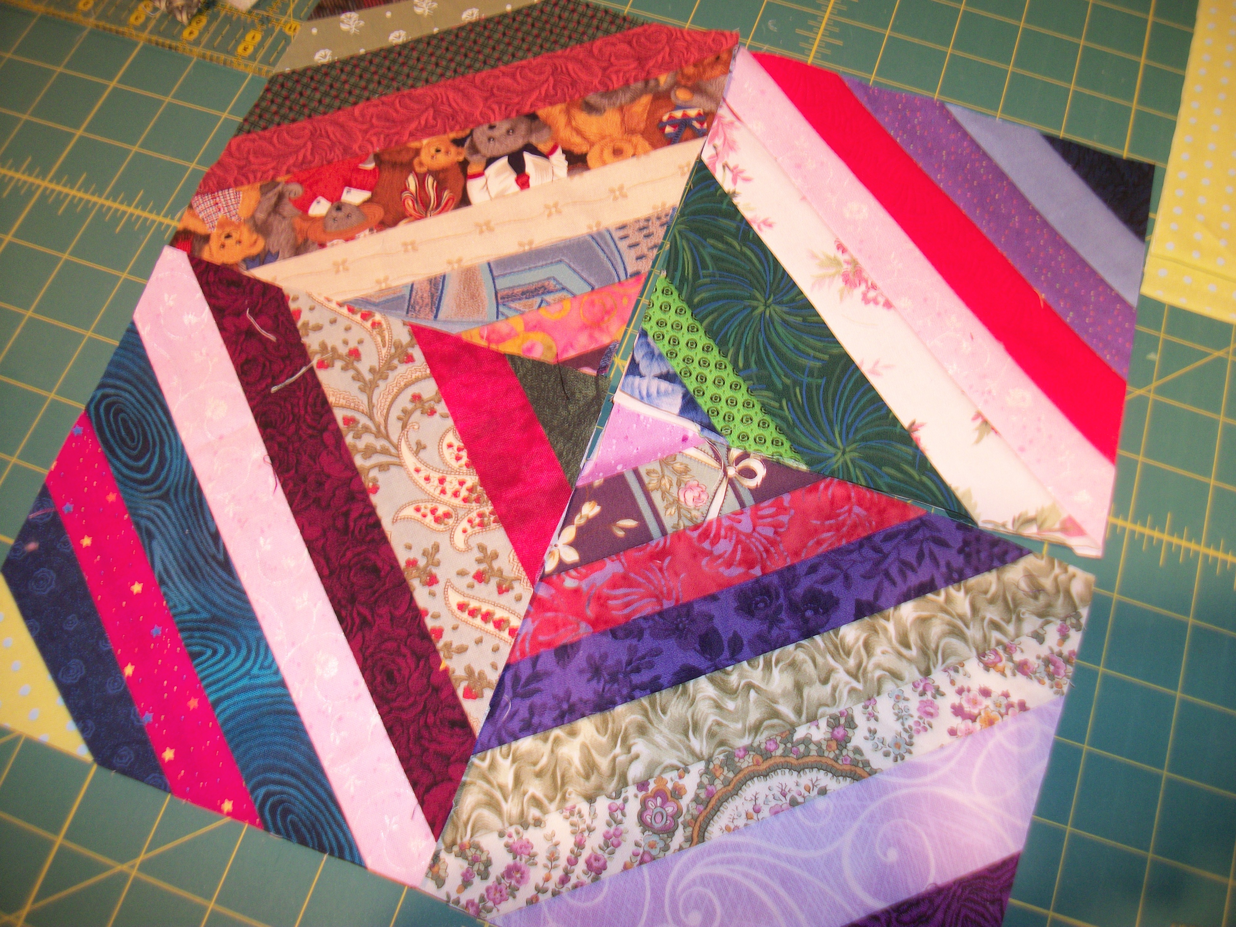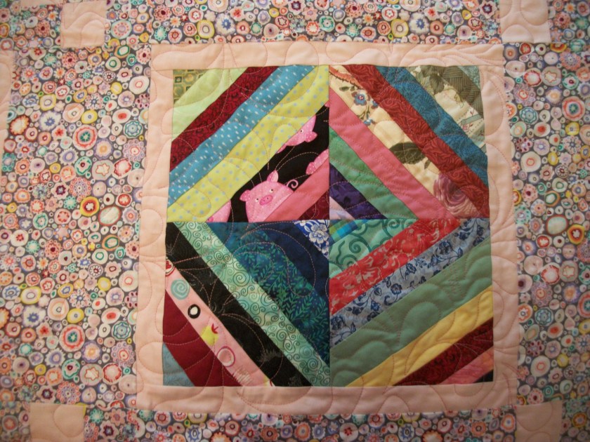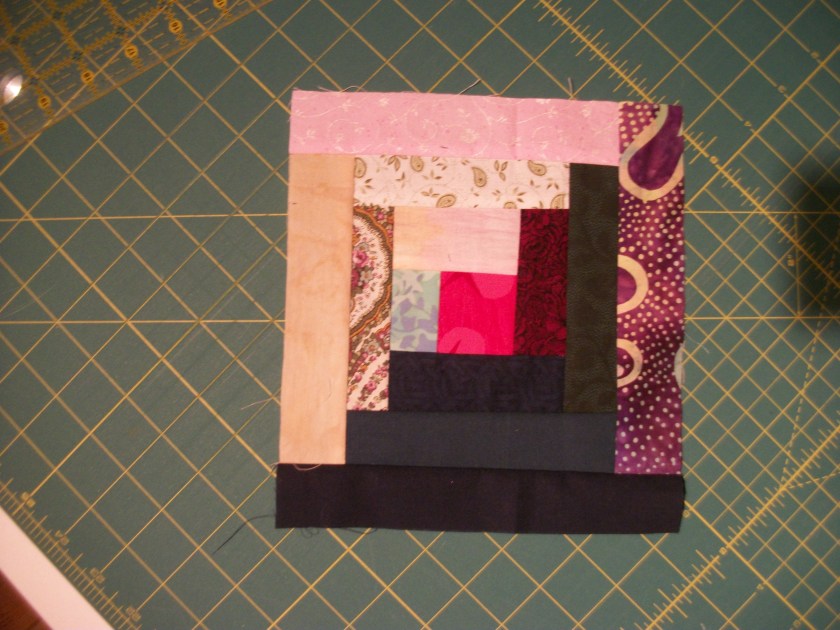 I played with making fabric from the crumbs–which was kind of interesting. And you could cut squares out of a piece like this and use the remainders to form more blocks. If you use those blocks as a center with sashings around–or as a center to a larger pieced block, you’d have an interesting quilt.