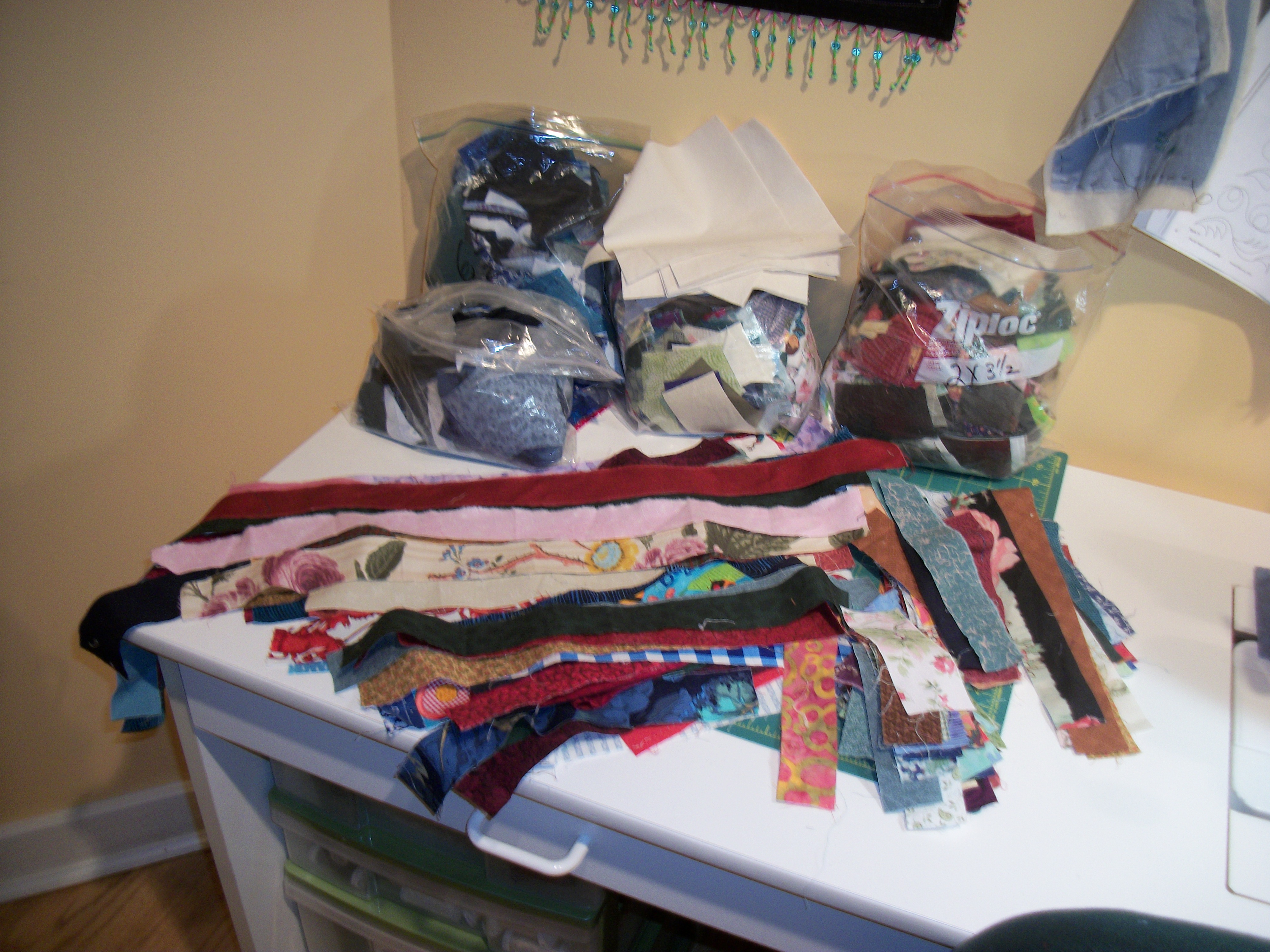I learned from Bonnie Hunter to call them “crumbs,” and to use them. Quilting fabric is now around $12 a yard and the width has shrunk from 44-45 inches to 40-42. (How greed can kill an industry.)