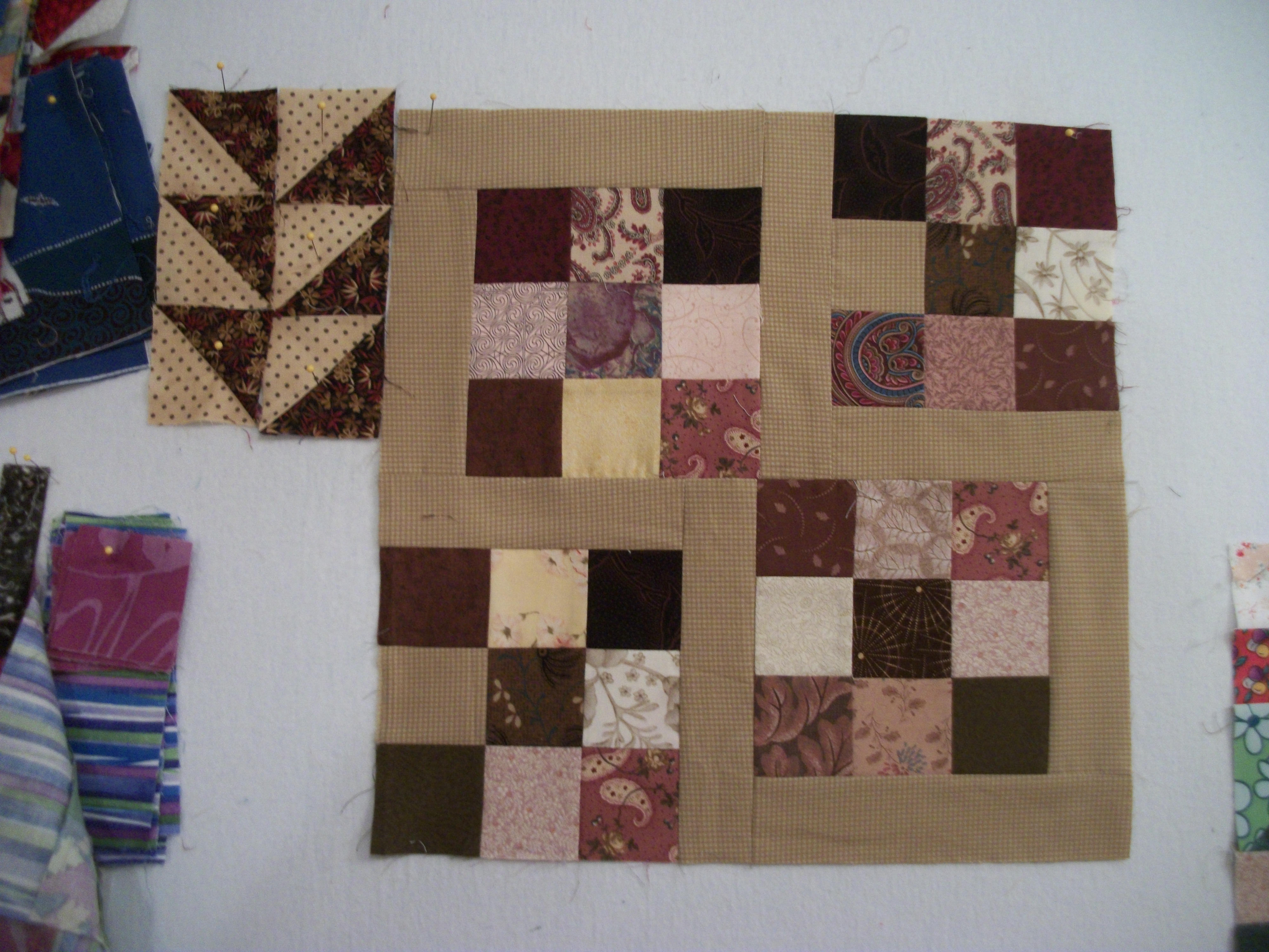 I am making myself sew together the quilt top of another Dancing Nine’s quilt top–as I’ve got a lot of really beautiful fabric left over from the Wheels of Mystery quilt.  Here’s one set of blocks: