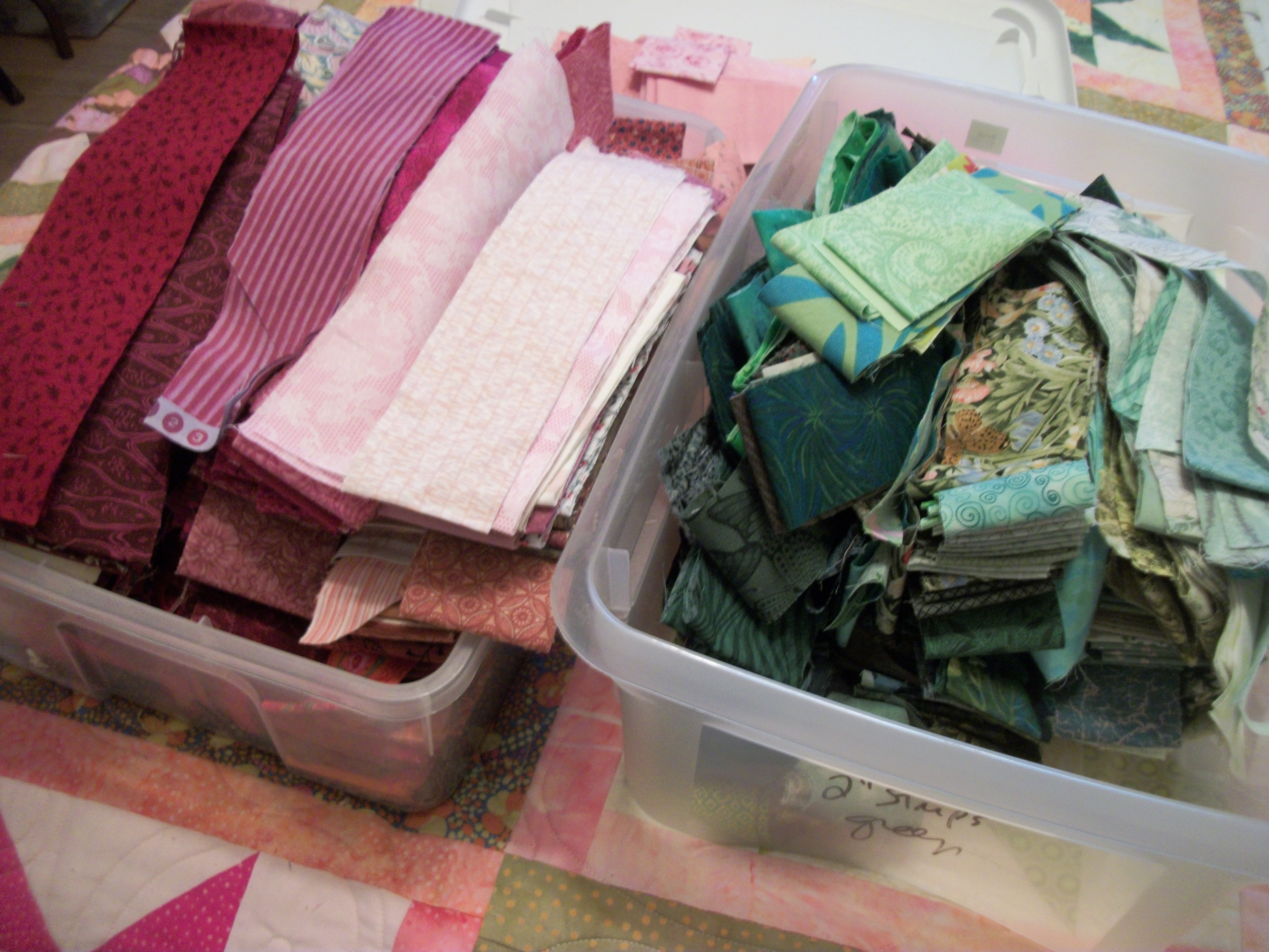 And I’m pulling from the 2-inch red and green strip bins from the cutting frenzy this summer.  It’s so EASY just to pull pre-cut strips from the bins and not have to wade through a ton of fabrics in the stash: