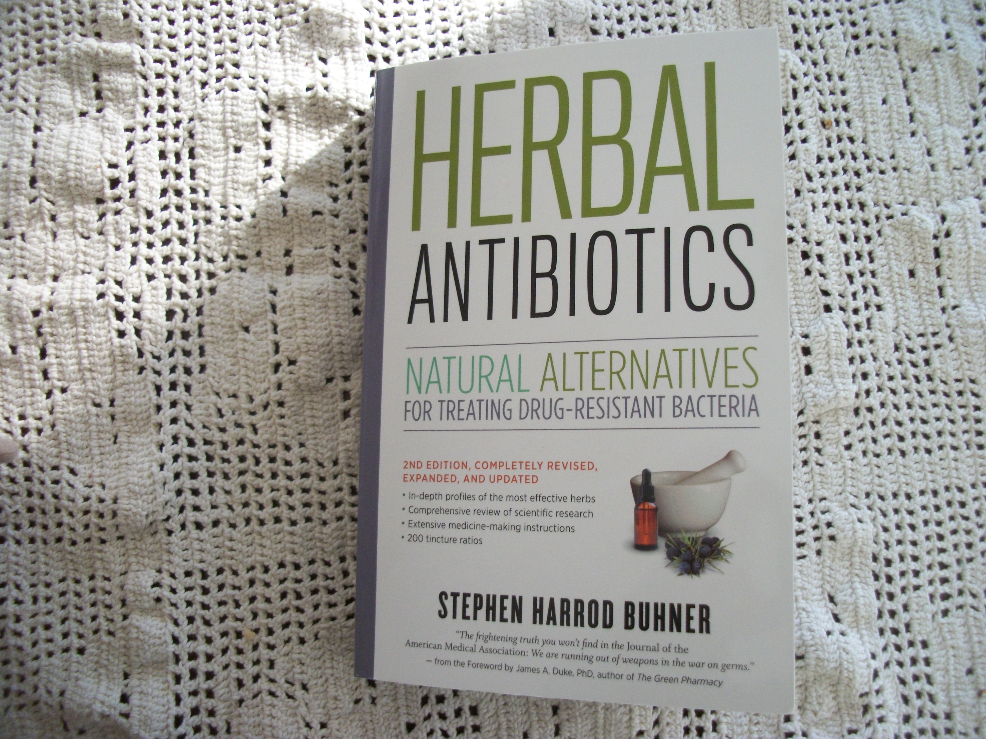 Buhner argues in HERBAL ANTIBIOTICS that our only solution is to return to plant-based medicinal strategies.  This book is daunting in its scope.  I feel like I did when I first started reading NOURISHING TRADITIONS with all its information and new ways of handling food.  But, by now I have waded deeply into traditional food ways and into sourcing local foods and into thinking about and researching alternative medical strategies.  So, I will begin with baby steps with finding ways to use herbal antibiotics–remembering that all the most powerful medicines are located in plants, which themselves organize through chemicals.  That would lead to Buhner’s THE LOST LANGUAGE OF PLANTS, which was an eye-opener for me and which I will write about in a separate post.