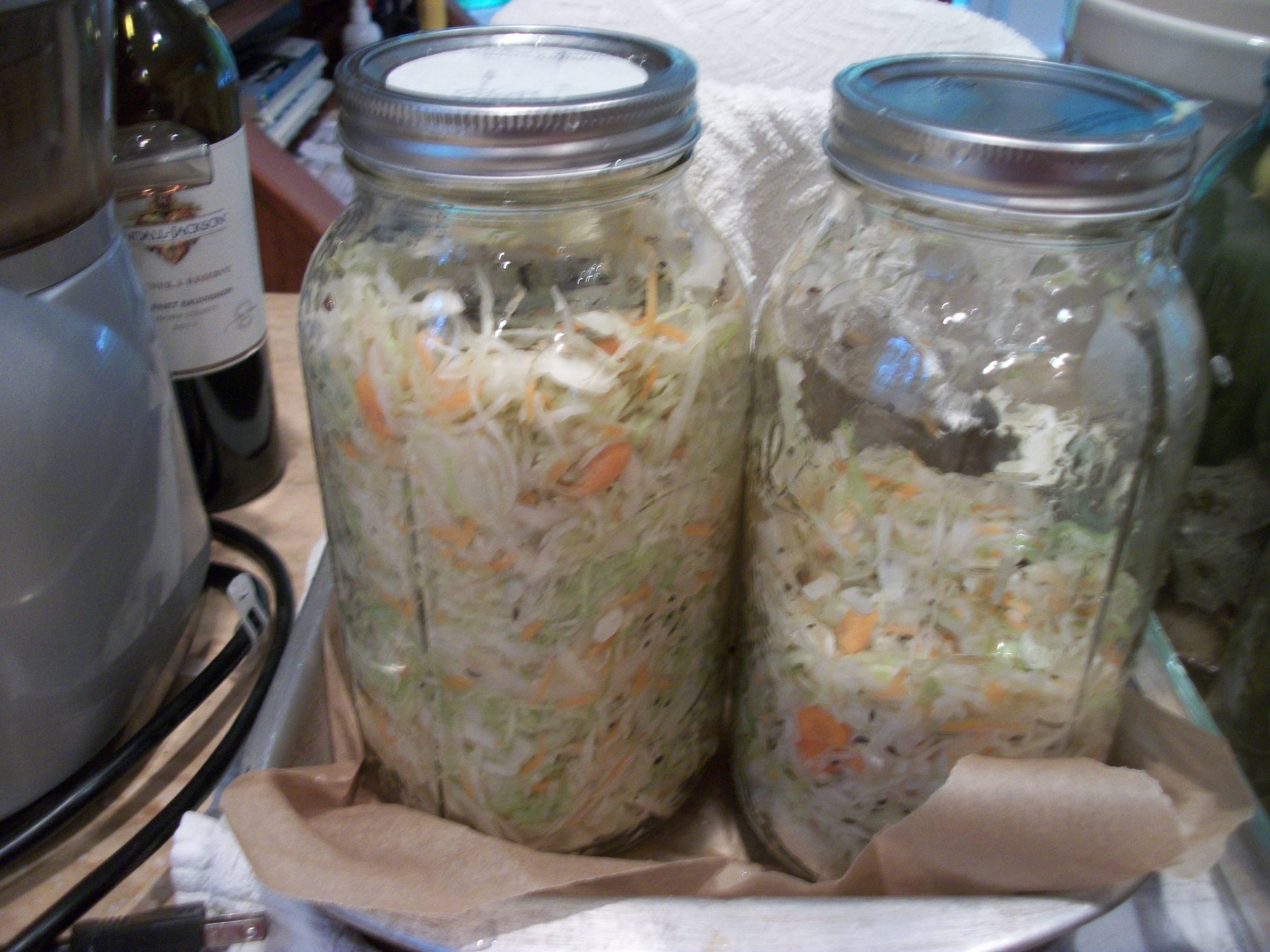 The second project was some mixtures of cabbage (red and white), leeks, onions when I ran out of leeks, kale, carrot, one had a turnip, more garlic, and sage.  I decided to do at least two mixtures of just cabbage, carrot, and caraway seeds–the traditional mixture from NOURISHING TRADITIONS (Sally Fallon Morell and Dr. Mary Enig of The Weston A. Price Foundation) with which I started this journey.