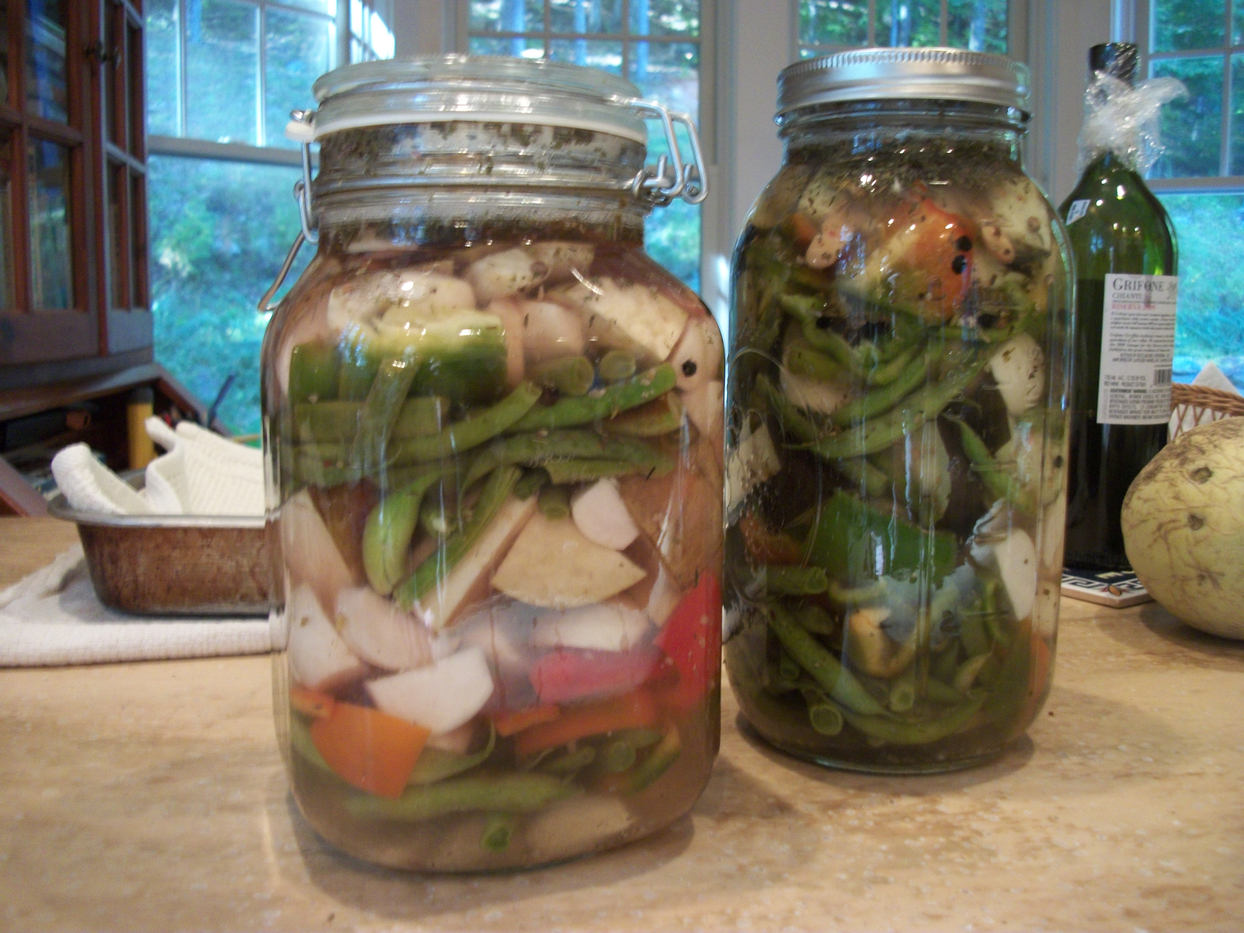This batch has eggplant cut into chunks, carrots, beans, salad turnips, green peppers, red peppers, and so forth.  Green beans are delicious done this way.  And, of course, Katz has a recipe for New York garlicky pickles that is delicious!  I can’t get enough of them.