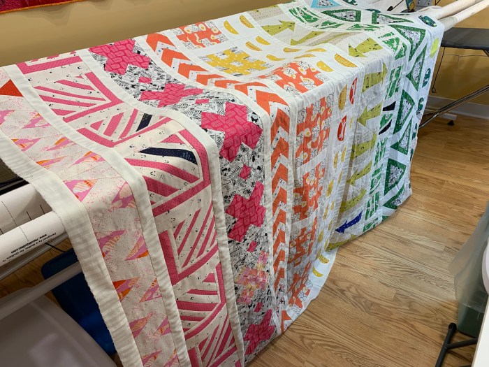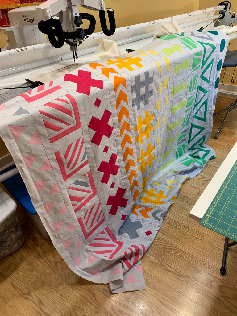 Somehow I made two rows each month—one in this solid rainbow version, and one in all Cotton+Steel. I sat on these finished tops for a bit as I thought about how to quilt them. I didn’t want any quilting that distracted from these very graphic blocks. And I like to make soft quilts that are functional, so I didn’t want heavy quilting—assuming I have the patience for that, which I clearly do not. I chose just simple wavy lines and am very pleased with the result. I will do that in the other quilt as well.