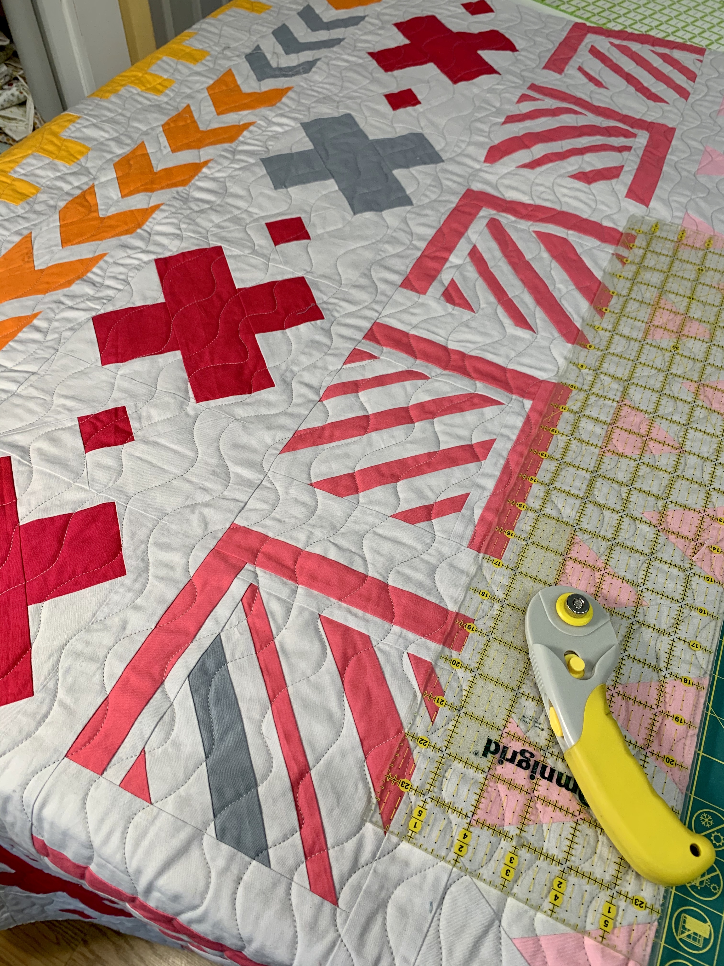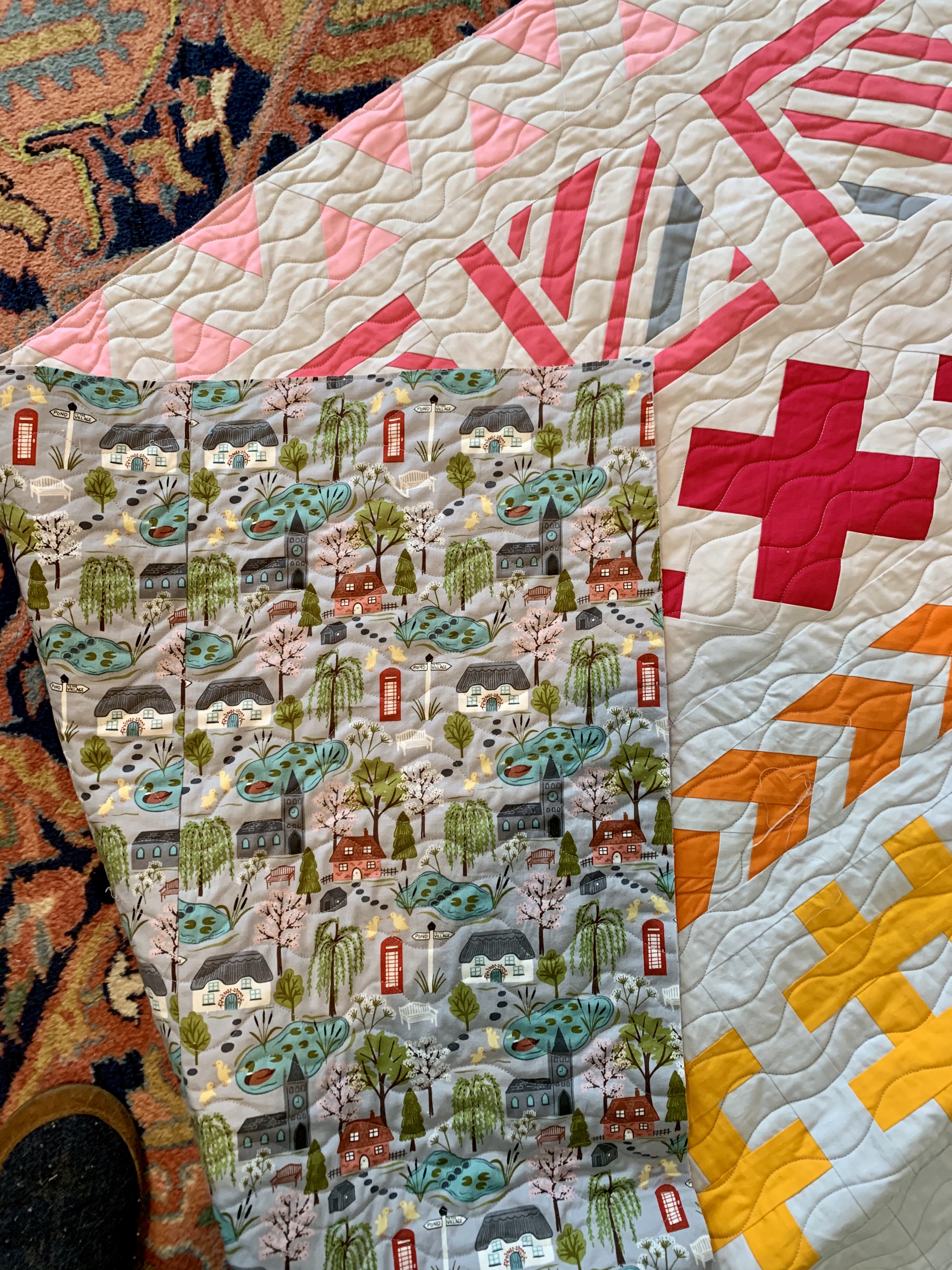 Admiring how the soft, traditional backing I chose works to soften the graphic nature of the top.