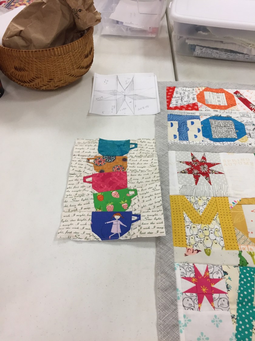 Margaret Elaine Jinno is still working on my quilt AND had an operation on her hand this week.  The five coffee cups represent my sons and DILs.  Get well ME, so you can SEW again.