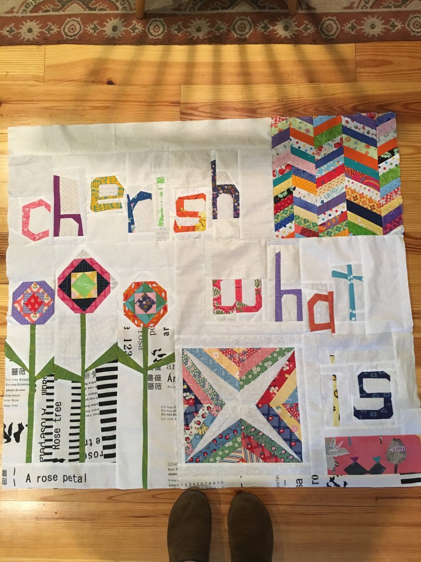 Here’s is Becca Babb-Brott’s addition to Vicki Fletcher’s quilt:  “Cherish What Is” and linking up completed parts into a whole.