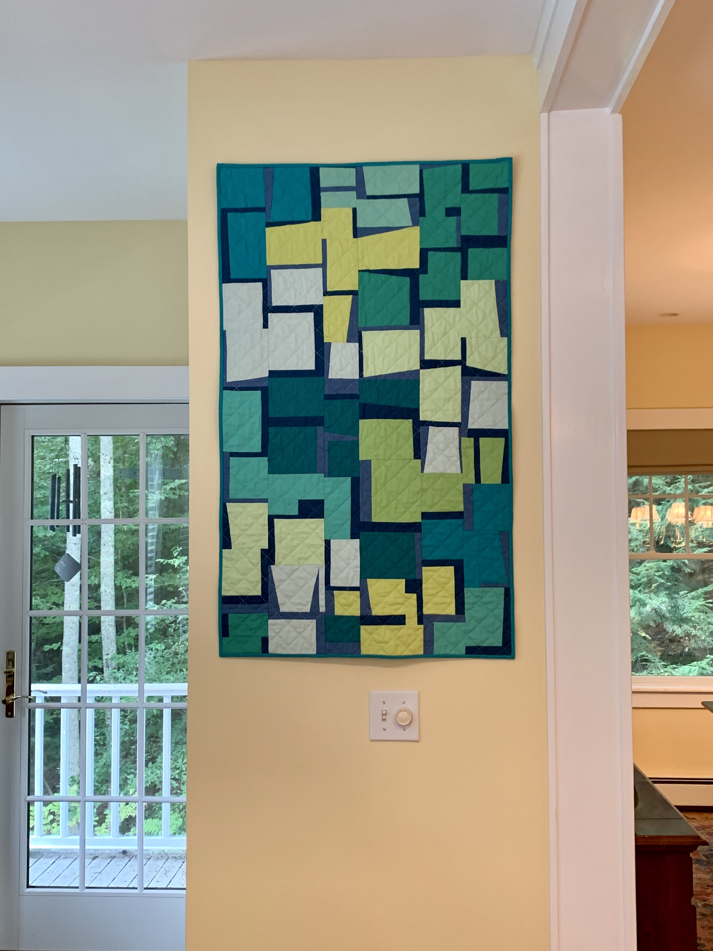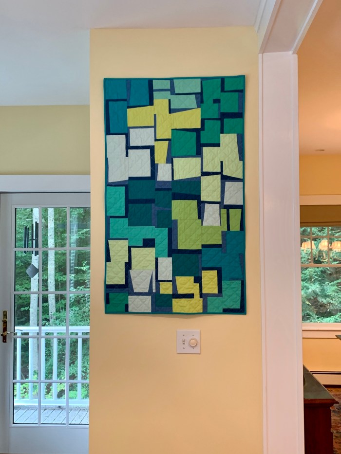 I finished “Fractures” last night and hung it outside my quilt room this morning—after retiring one quilt and moving another.