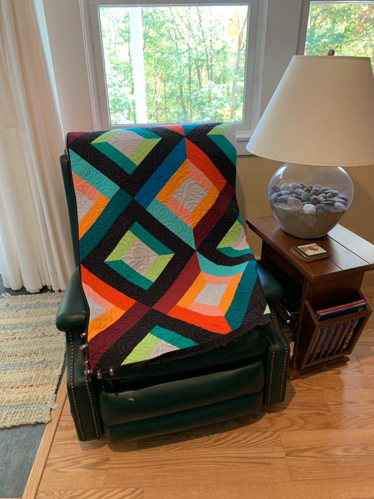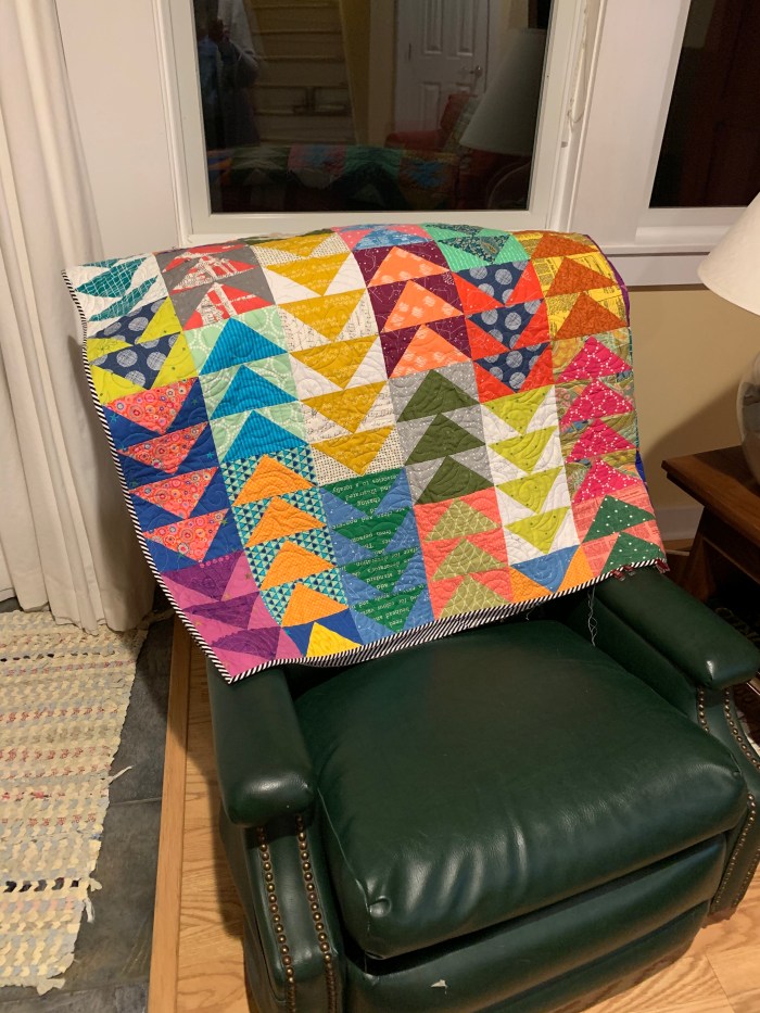 I am putting binding on my “On Point” quilt from The Color Collective, season 2, designed by Denyse Schmidt. She also chose the fabrics and this placement of the colors. I like the way my quilting choice came out on this quilt—it has lovely texture. When the binding is done I’ll post pictures of the whole thing. When I’m sewing binding on a quilt I fold them and put them on this chair so I can admire them as I come and go during the day.