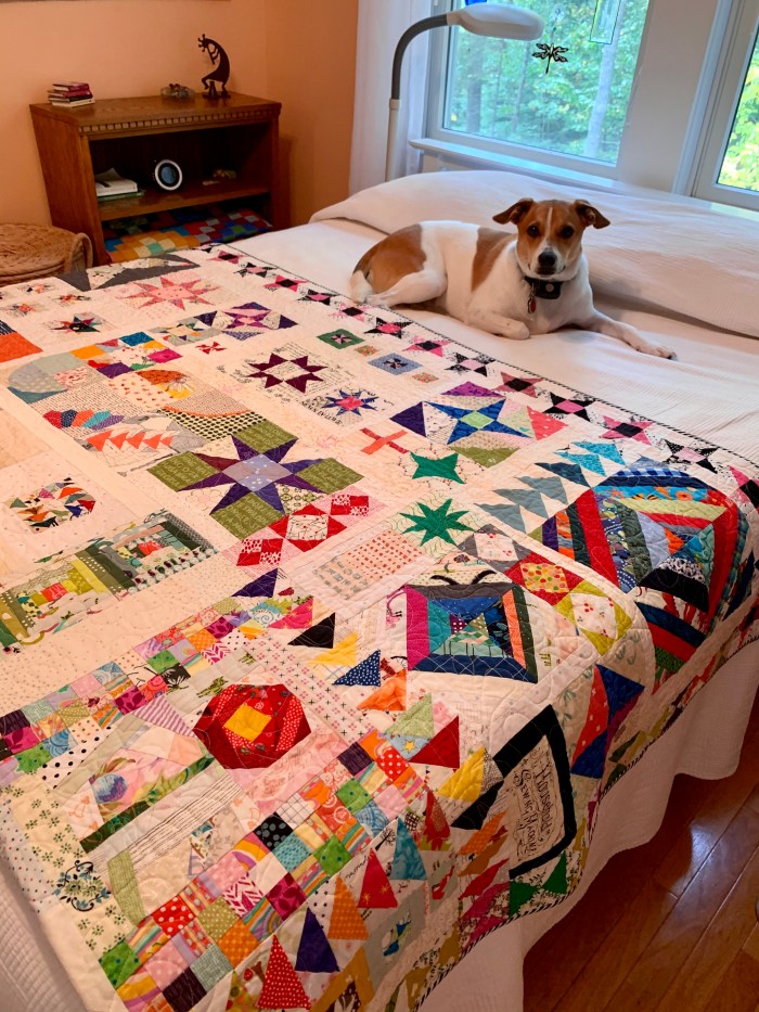 Nights have been much cooler, but rather than organize a wool blanket for my bed, I chose a quilt—the improv quilt I made in 2019—“Parts Department Party”—that includes blocks from two friends as we all made an improv quilt with our shared blocks. (This quilt is BIG and is folded in half here. Here’s the 2019 post that has all the pictures: https://louisaenright.wordpress.com/wp-admin/post.php?post=11105&action=edit)