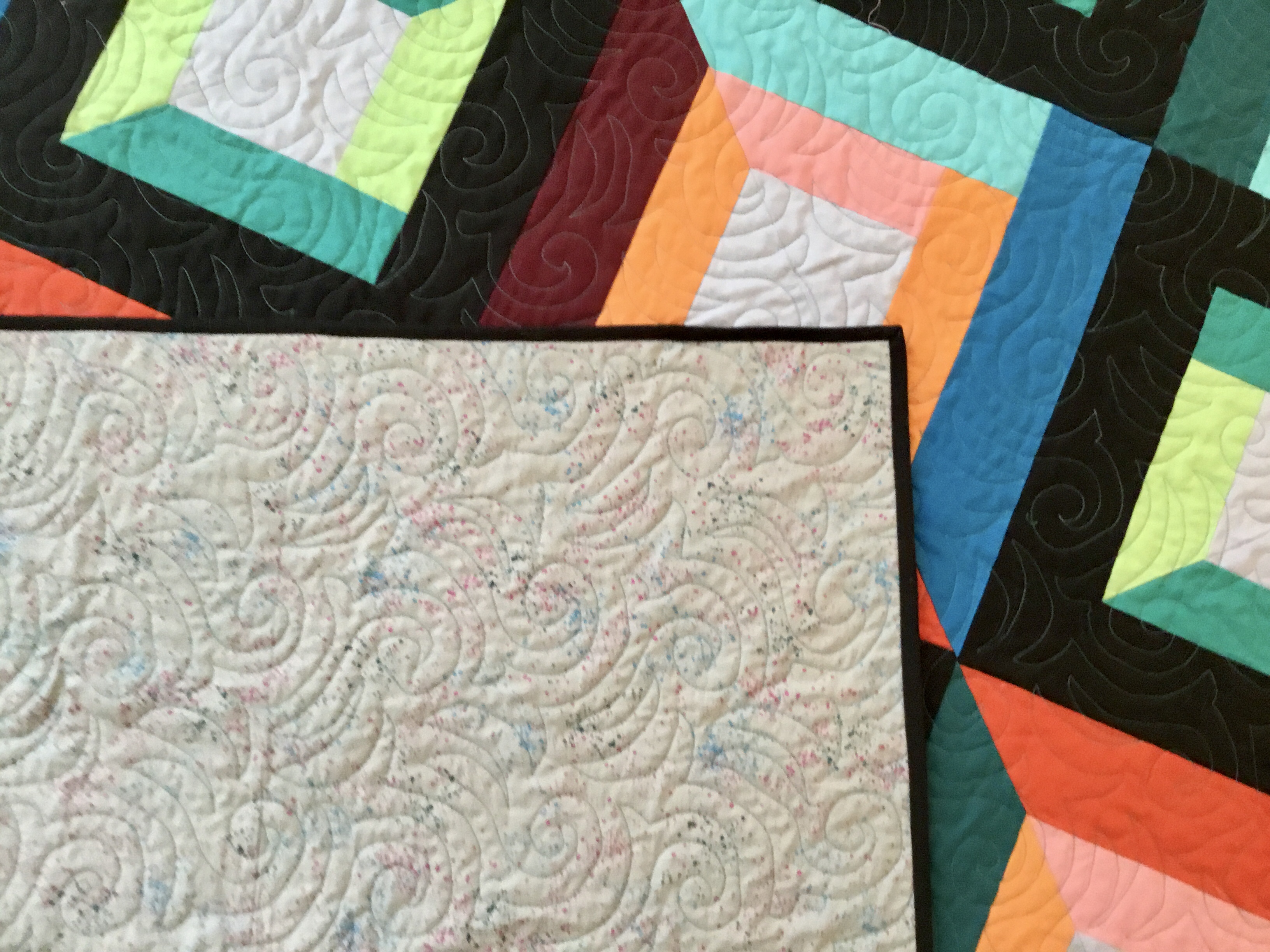 The funky rail fence block is super fun to make. I used a suite of fabrics I’ve never used—and added fabrics from my stash. I pieced the back with the remnants, so that’s a lot of fabrics out of the stash. And does it count as an almost-created Unfinished project since I did have a suite of fabrics kept together? I think so. I do NOT want to be one of those people who dies and leaves a huge amount of fabric for my family to manage.