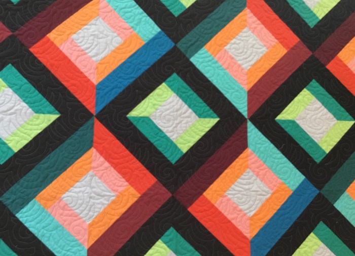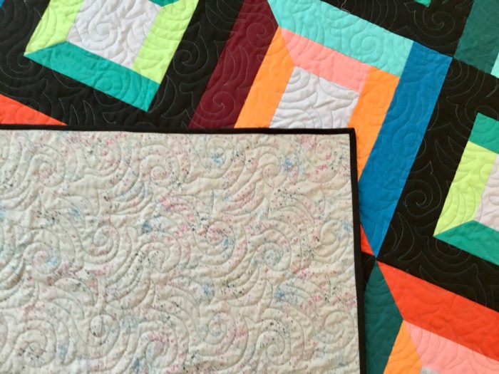 Here are some close-ups. The quilting is not 100% perfect all over the quilt as this ruler was a learning curve. Now that the quilt is bound, washed, and dried, one would not notice the kinds of things I note about the quilting. It’s all good, and I’m happy with the results.