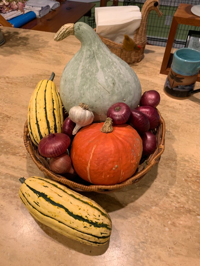 And look at these beautiful squashes, garlic, onions, and shallots. They are almost too pretty to eat. The red onions are cipollini onions. I found a recipe to pan sauté them until they are caramelizing in the pan and then to finish them in the oven.