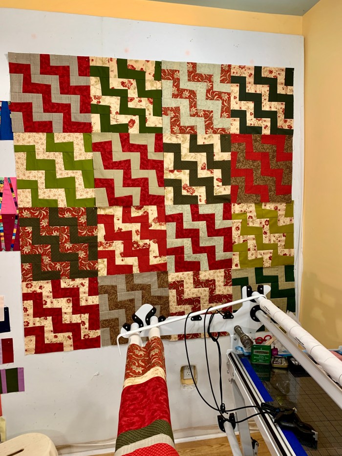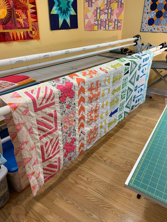 The funky rail quilt top from Sajata Shah’s CULTURAL FUSION QUILTS book and all the needed parts for the longarm joins the Flying Geese quilt with all its needed parts. I’ll start to longarm quilt these quilts pretty soon now.