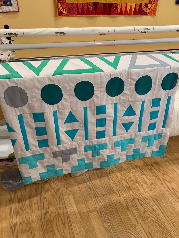I wasn’t quite sure how to quilt it, but opted in the end for this overall design with curves and some sharp points. I like the texture that developed a lot. The pantograph is Checks and Chase by Lorien Quilting. The row is 8 inches and is double, so 16 inches wide.