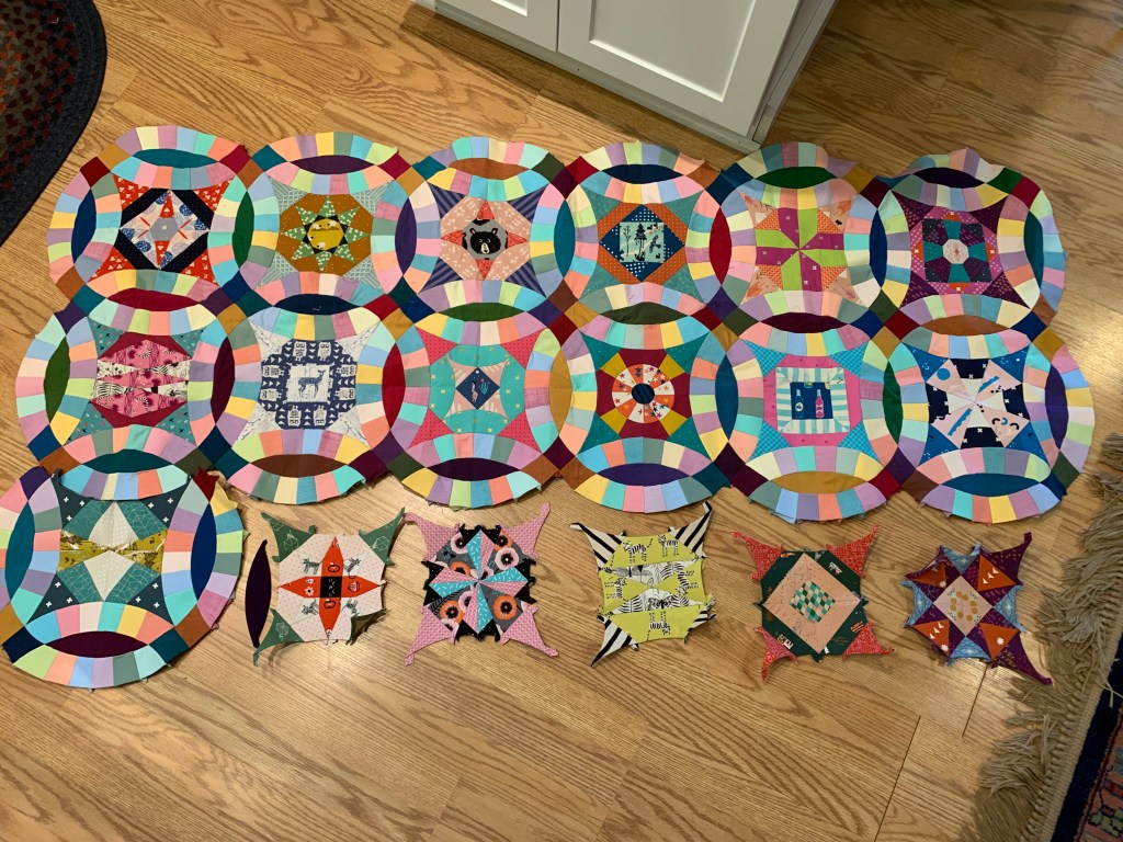 The small circle top is done, and I sewed it together and stay-stitched the edges this morning. I think I’ve found really good color placement and movement in this little top, which will be a wall hanging. I’ve organized a backing and the batting, so will put it on the longarm tomorrow to baste it. And it is now off the design wall. I’ll probably hand quilt it.