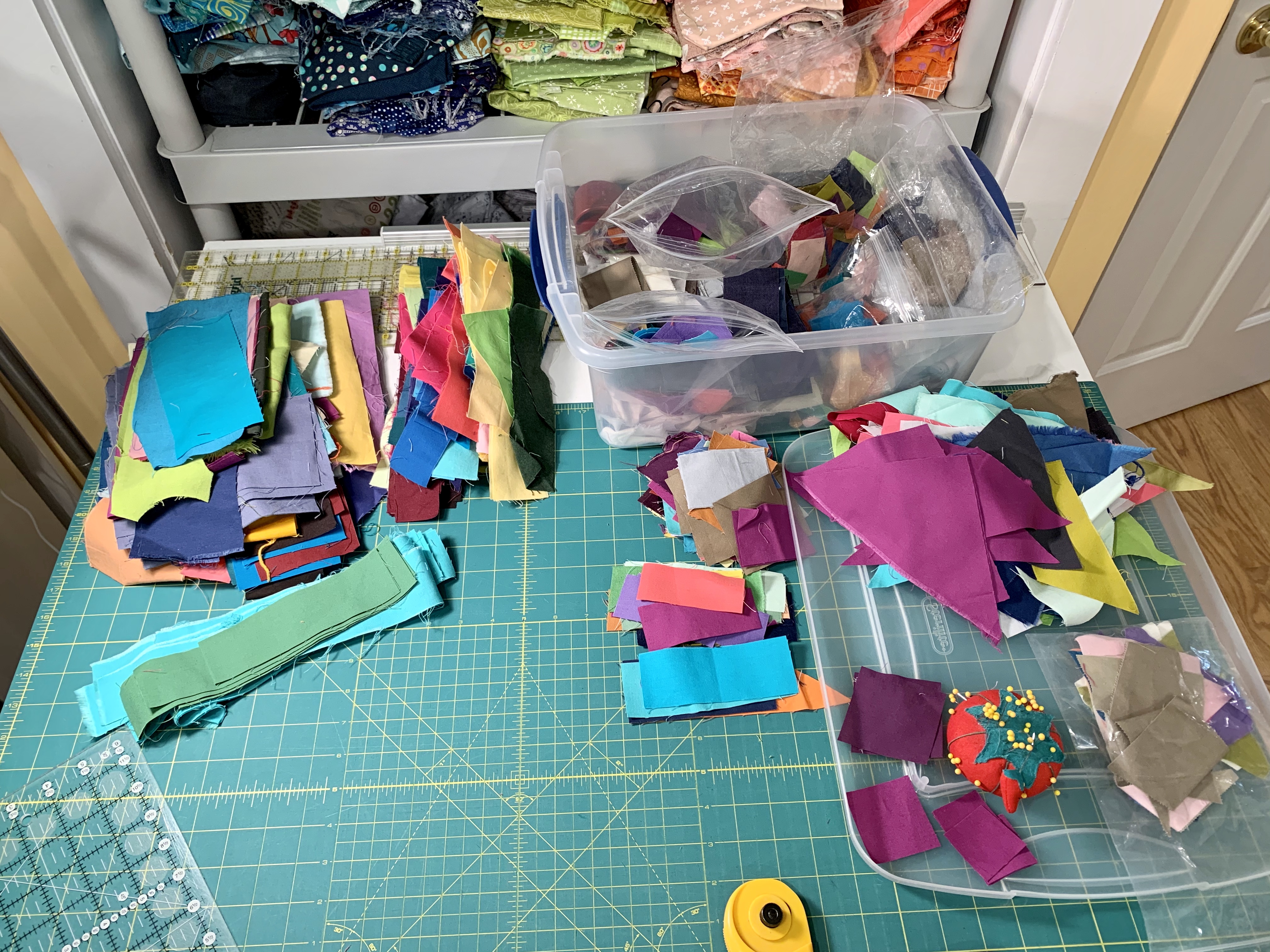 I pulled out the bin of solid scraps and sorted it—I have piles where the fabrics need to be cut into useable sizes—like, at the very least, different sizes of square blocks. The strips are going into the developing quilt on the right. Occasionally I dive into the bigger bins of bigger pieces of solid fabrics to get a color I want to go with what is here, or to cut new squares for the trees quilt.