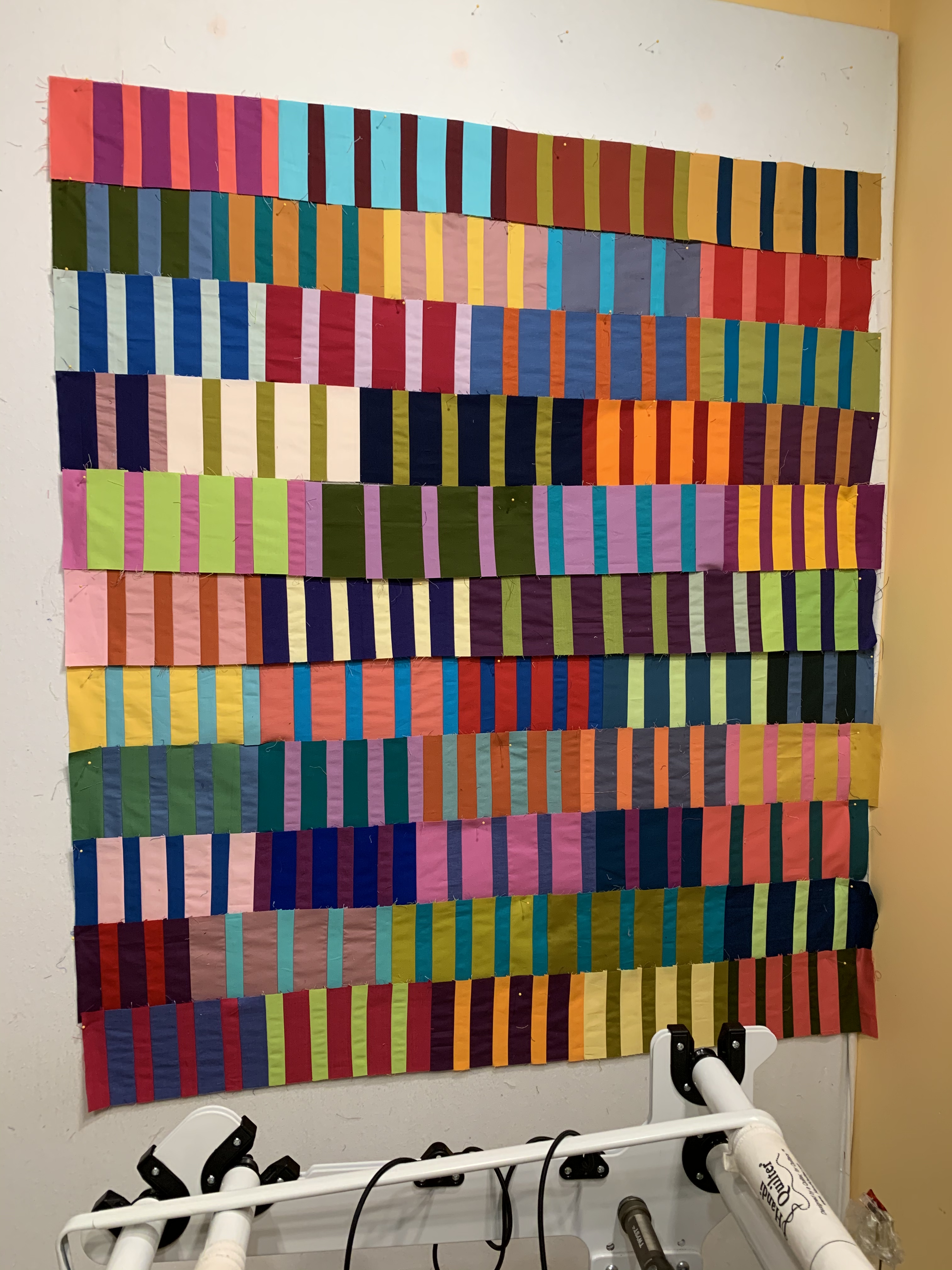 I’ve got the rows sewn together for this very interesting quilt inspired by one Tara Faughnan made. She has classes on color in which she uses her quilt like this one as an example. I need one more row at the bottom—which should be lighter. It will finish at 50 wide by 60. Easy Peasy. I’ve taken a ton of pictures along the way while trying to check and recheck how the colors are working together. This quilt is made mostly from my solid scraps, not my larger pieces of solid fabrics. I think it will need a dark binding to hold it all together…