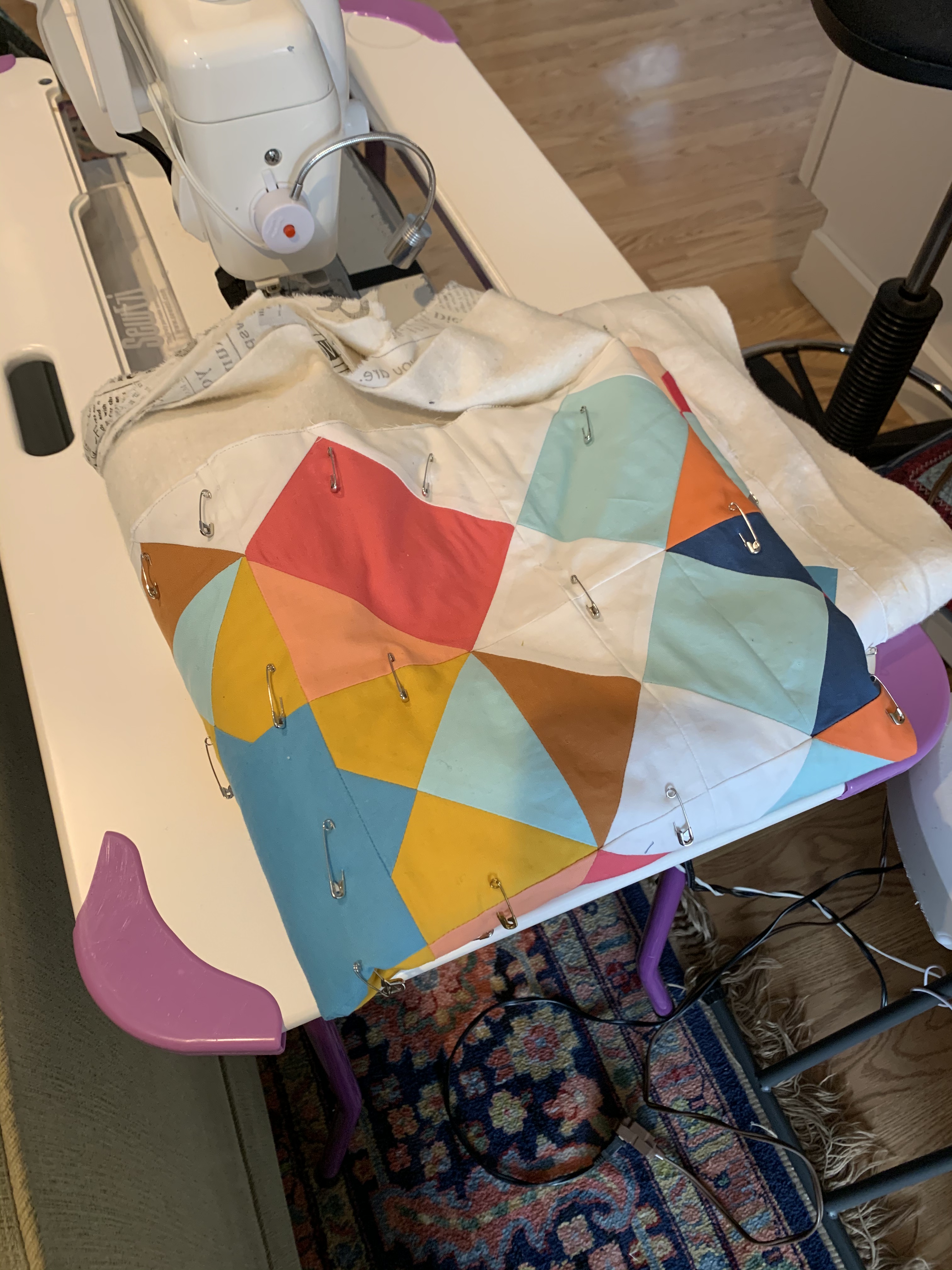 Marrakesh, designed by Tara Faughnan for The Color Collective online class I’m taking, is ready to quilt. I started the first line of matchstick quilting and realized there was a HUGE fold in the batting, starting about 1/4 of the way down. How on earth…??? I put smaller quilts I’m going to quilt on my domestic on the longarm to layer and pin. I can’t imagine how I missed a fold in the batting along the way. The quilt WAS pinned more intensely, but I had to put it back on the longarm and take most of the pins out and then repin it. And, yes, the fold was bad and thick, so there was no choice. Anyway, I’ll probably spend some time with Marrakesh later today. I can watch tv from this spot I’ve set up. I really enjoyed Selena The Series on Netflix, by the way. I had no idea about this story.