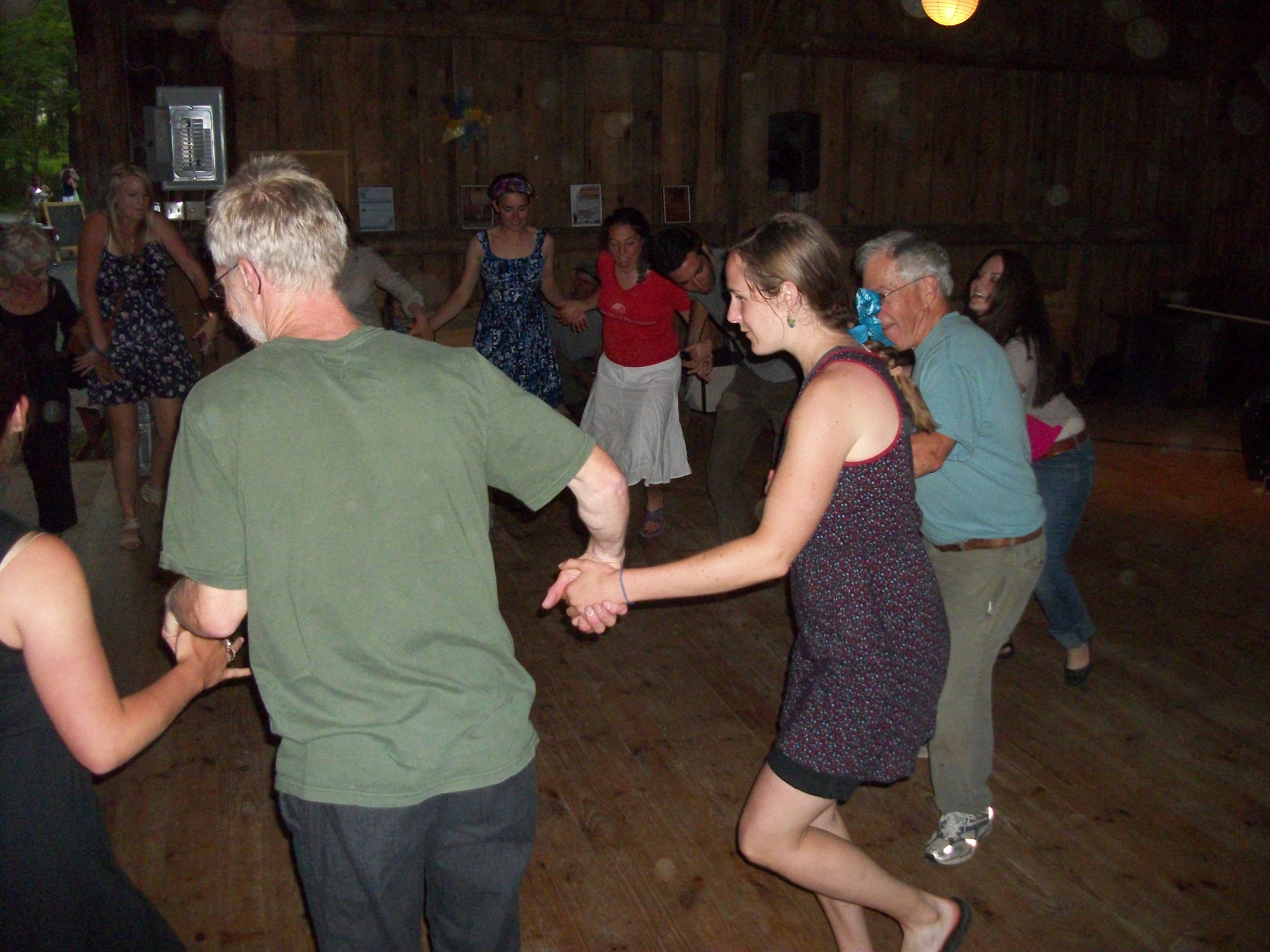 Then the real dancing began.  There were at least three sets of circles–and sometimes lines–depending on the dance being called–and as darkness fell, the energy in the barn reached whole new heights.  Dancers of all ages whirled and twirled and laughed and moved–sometimes so fast you could hardly see them.  Here’s a very tame picture of one dance.