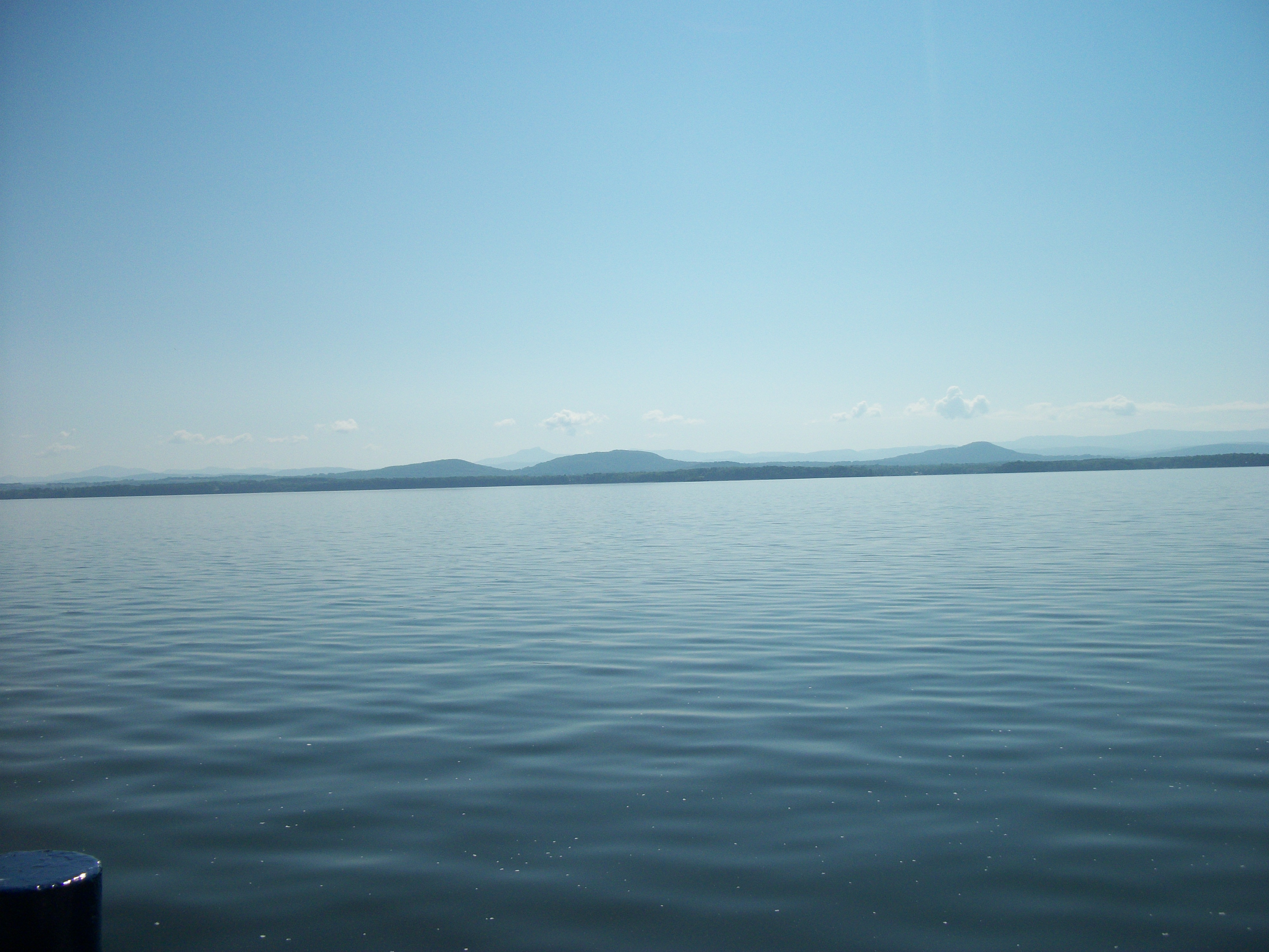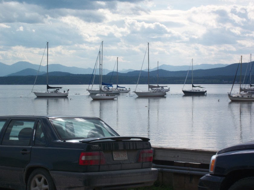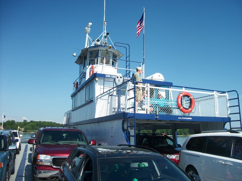 Western Maine is beautiful, and one gradually drives up into the mountains which host some pretty amazing ski resorts.  In New Hampshire and Vermont, we drove through the White Mountains and across the northern part of the Green Mountains.  The scenery is breathtaking–filled with dense mountains, rushing rivers, and mountain farms.  Outside of Burlington, Vermont, we went south to get on the Charlotte-Essex Ferry.  Lake Champlain is bordered by lush farms and ringed by mountains–on the New York side, it’s the Adirondacks.   Here’s what we saw at the ferry:
