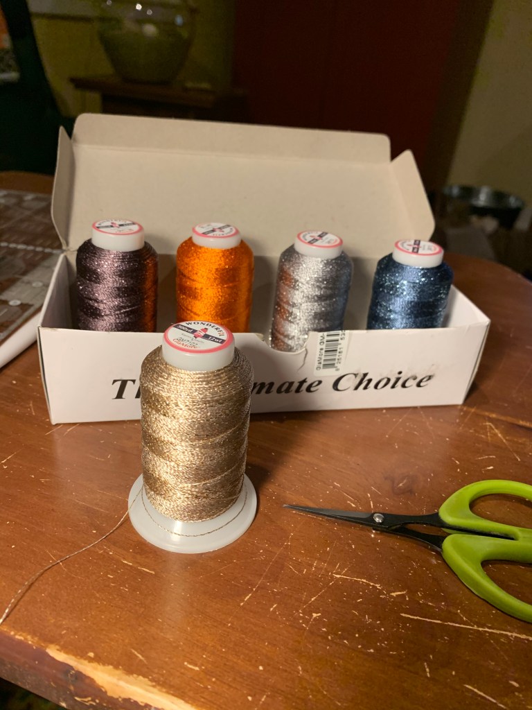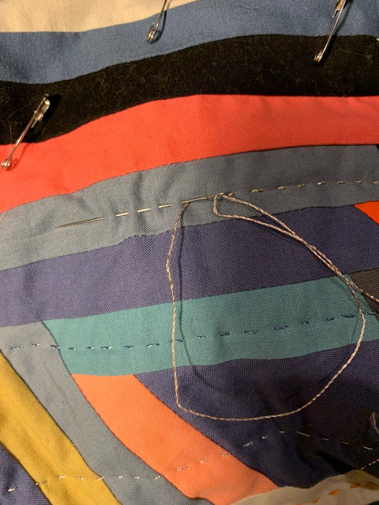 The Galactic wall hanging top is finished, layered, pinned, and waiting for obtaining some Wonderfil GlaMour thread—a rayon with a metallic strand—that designer Tara Faughnan used and loved. Marge Hallowell at Mainely Sewing is going to carry this thread. I am hoping she can mail me some. I LOVE this quilt and this pattern. Tara Faughnan designed it and curated the fabrics in THE COLOR COLLECTIVE online class by Amy Newbold’s Sewtopia.